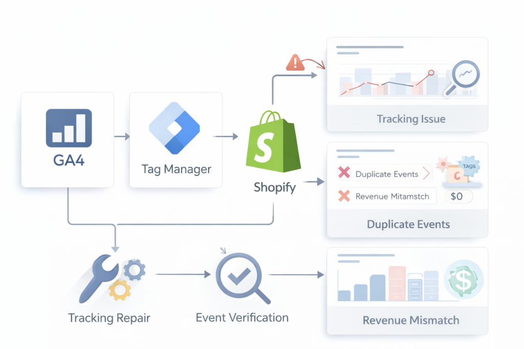 Many Shopify analytics problems come from small configuration mistakes in GA4 or Google Tag Manager.